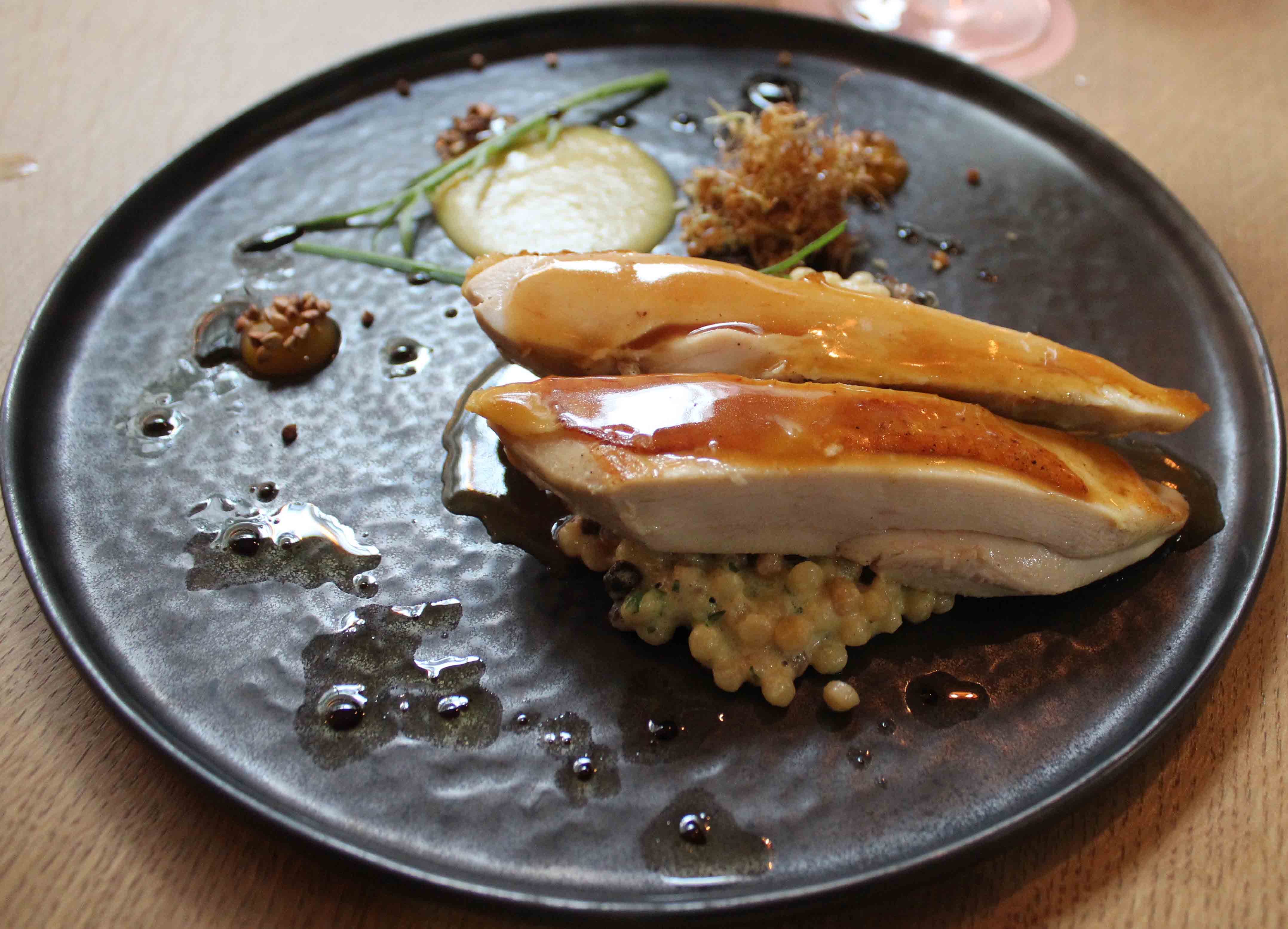 Could the next dish live up to this? Here we had strips of chicken breast on a bed of creamy fregola risotto, with marmalade egg yolks, a small crunchy nest of fermented and fried corn, corn purée and a vinegar reduction. The chicken was succulent and tender though I felt it could have done with a smidgen of salt. The sweetness that the three nodules of the marmalade yolk brought to the dish was perfectly measured. I absolutely adored the texture combination: when I brought together on a fork, the chicken layered on fregola, corn crunch and marmalade yolk, it all made perfect sense.