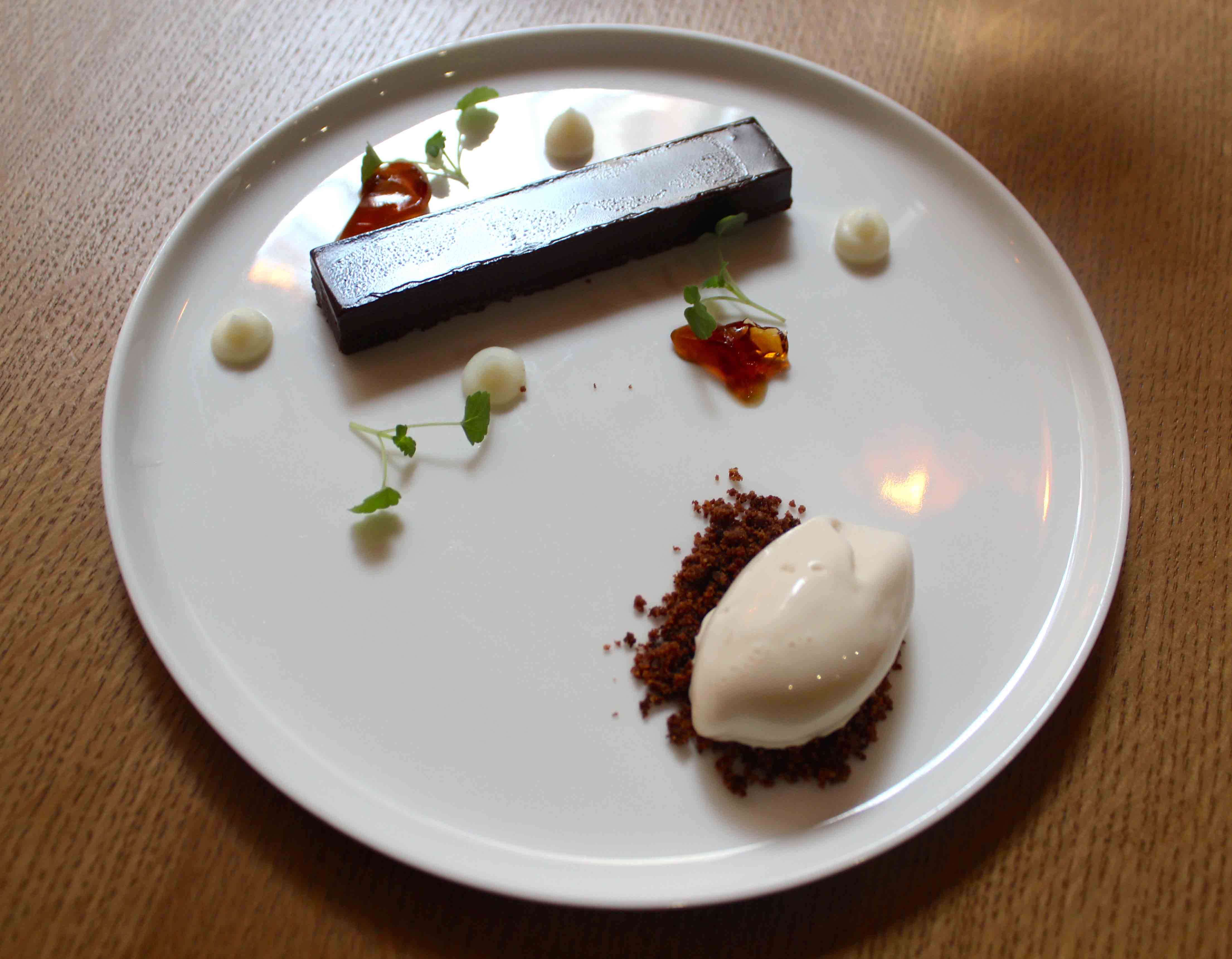 So far, so very good. Then came the dessert. Chocolate ganache, brown butter ice cream on a chocolate crumble, chocolate liquor jelly pieces and little knobs of rice pudding cream flavoured with verbena. Would it be sacrilege to call it a gourmet kit kat? Probably but components wise, the two aren’t a million miles apart. Taste wise, obviously incomparable. Absolutely loved the slight sharpness that punched through from the chocolate liquor jelly, juxtaposed wonderfully against the sweetness of velvety beurre noisette ice cream – flawless.