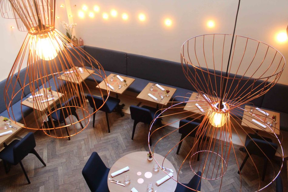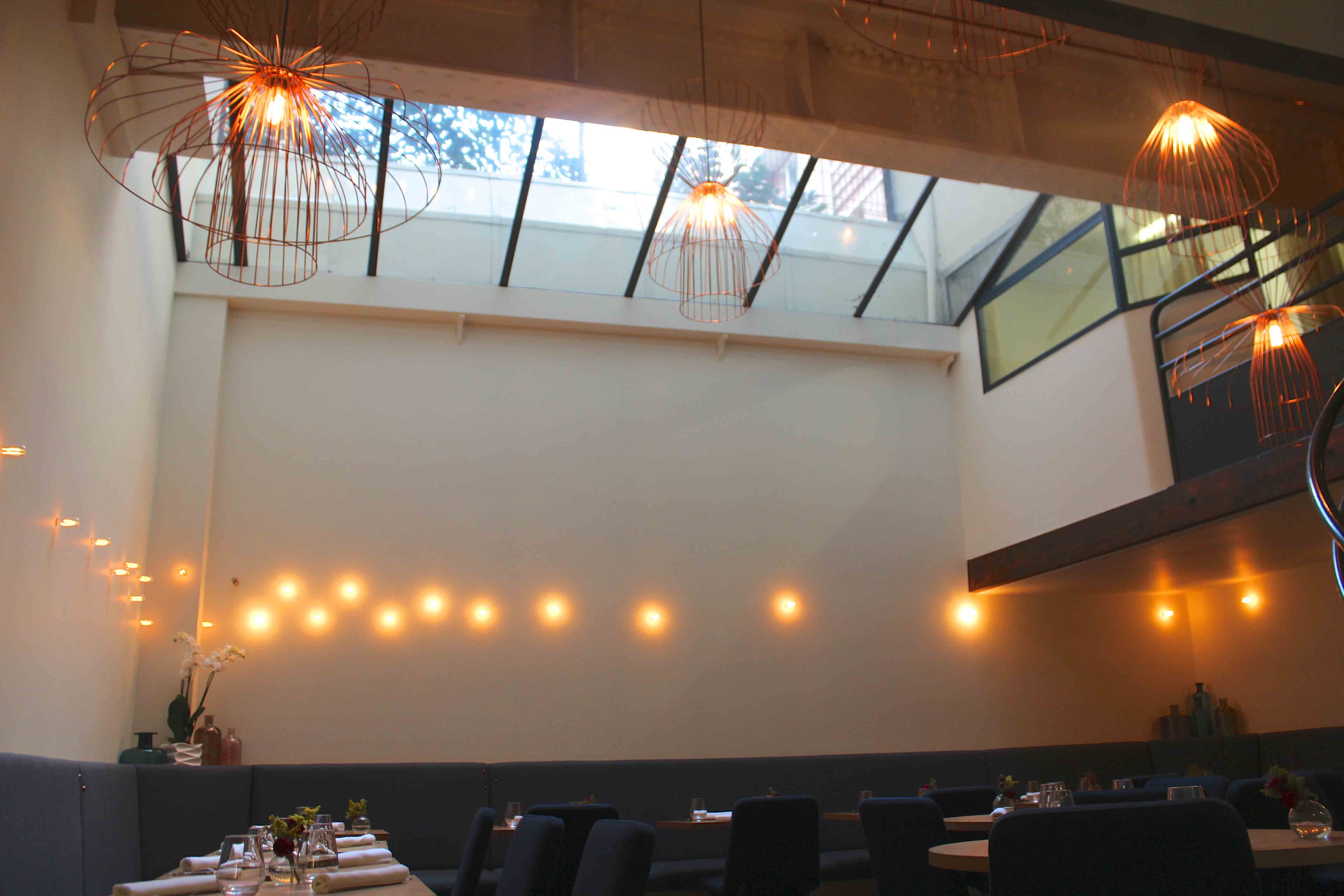 I also noticed copper pipes running on the interior of the glass wall that separates the dining room from the kitchen, the copper studs embedded into the padded backs of the dining sofa and the copper light hangings that act as the centre piece for the room. The space isn’t large, holding 32 or so people but during the day light pours in from the glass roof, so it feels quite bright and spacious.