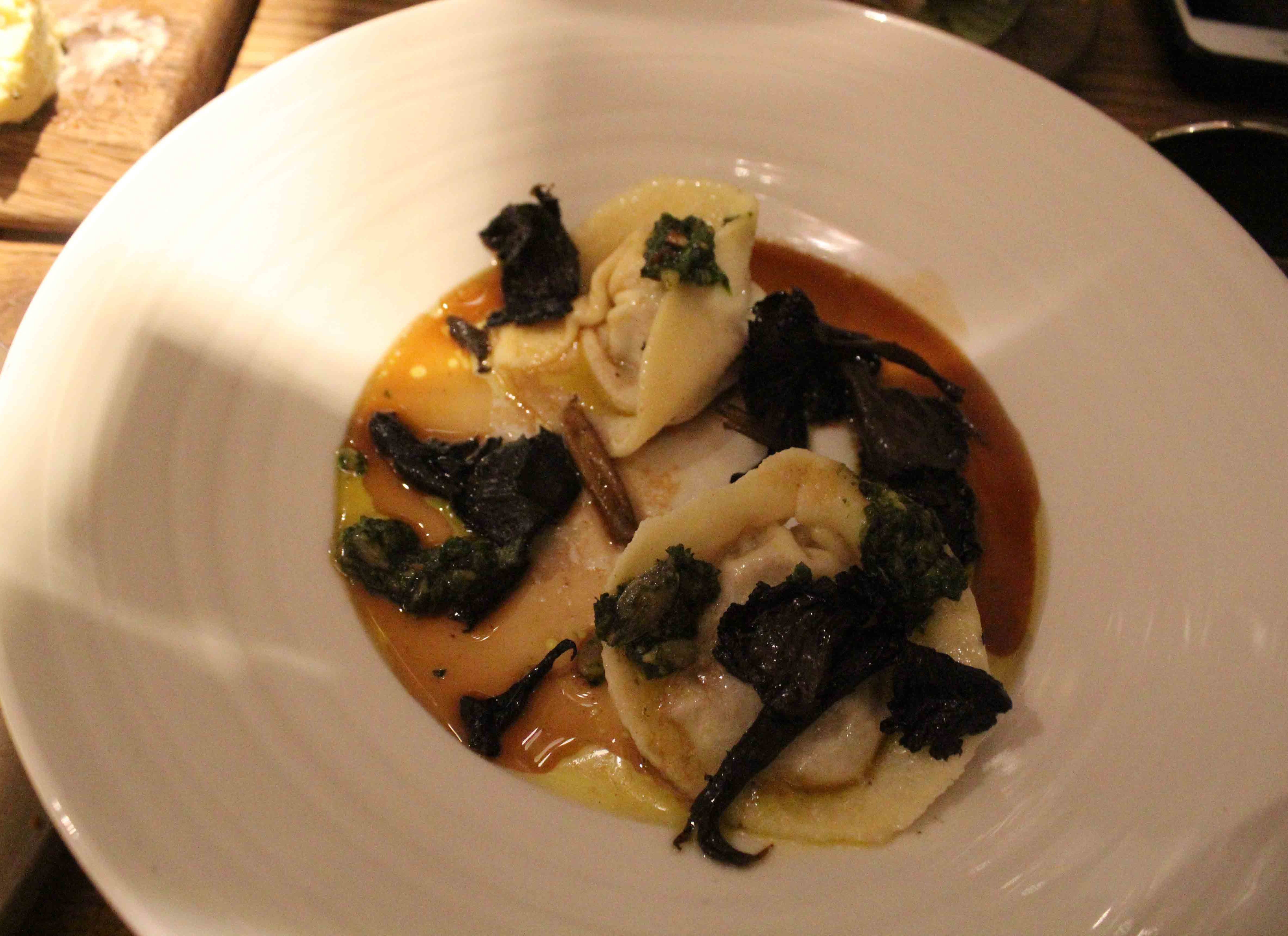 From the fast cooking section, much seemed very appetising indeed, namely the black cuttlefish gnocchi. However, we only opted for one dish in the end, from this chapter of the menu: the rabbit ravioli, bone marrow, yellow chanterelles and lovage pesto (£9.50).
