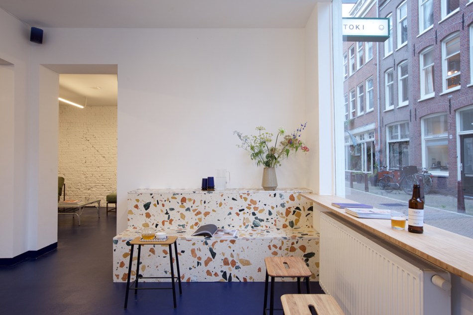 The moss green sofa (also in the back of the shop) is by LA-based furniture designer Stephen Kenn; beautiful flowers sit in a vase perfectly laid and minimal, in what seems to be a typical ‘Dutch’ way of flower arrangement; and offbeat magazines are available for Toki dwellers to peruse.