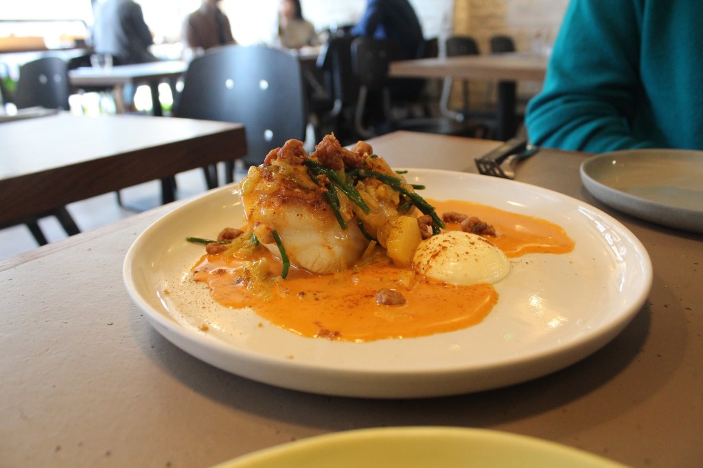 Plates take a while to emerge from the kitchen but delight when they finally do – there were no dud dishes. The chicken liver parfait was in a word – sensational; especially when paired with the black garlic and pickled pumpkin. A miniscule chip, deep fried with beef fat and topped with a bit of crab – £3.50…I hate myself for loving it.